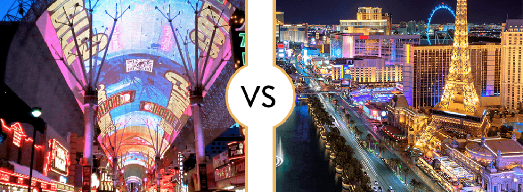 ON THE LEFT IS THE FREMONT STREET EXPERIENCE. IT IS IN THE CITY OF LAS VEGAS. ON THE RIGHT IS LAS VEGAS BOULEVARD WHICH RUNS THE FULL LENGTH OF THE STRIP. BOTH DESTINATIONS ARE IN CLARK COUNTY.
