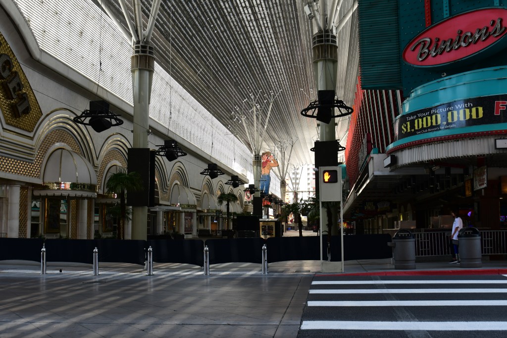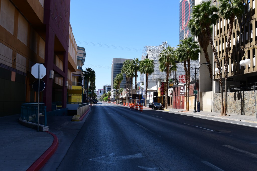 Like the Strip in Clark County, Fremont Street is deserted. (The distance from the Strip to Fremont Street is 5.4 miles.)