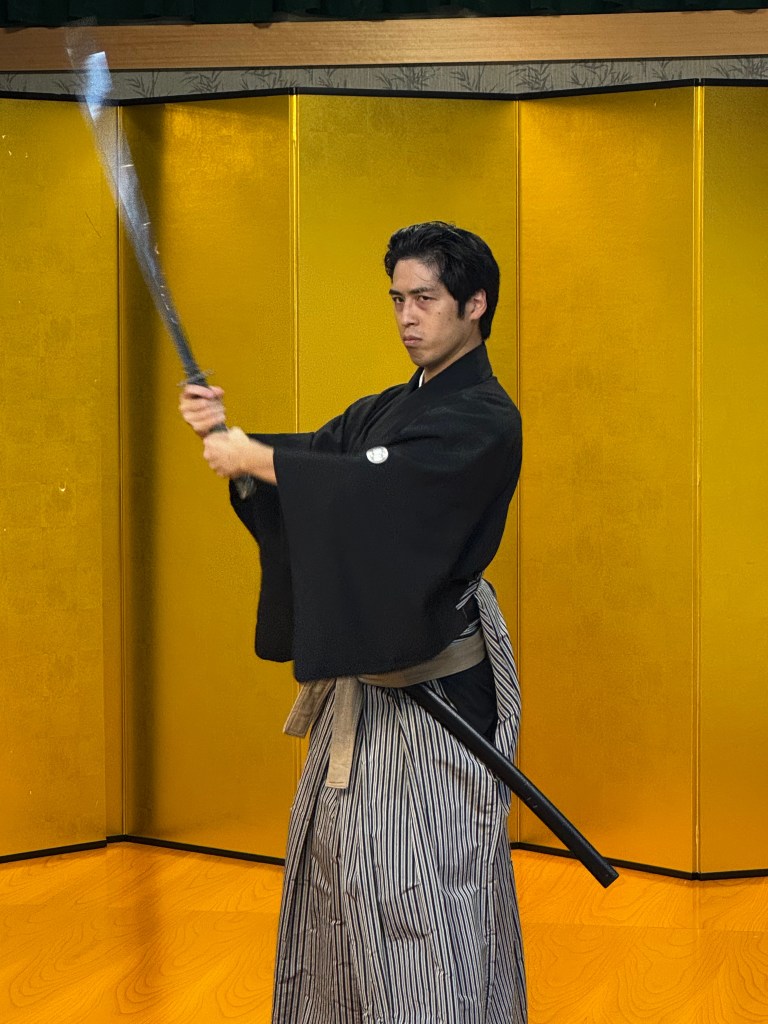 A professional demonstration of Samurai sword tradition is offered our group. After the professional demonstration, my wife demonstrates her skill but has trouble drawing a sword from her belted scabbard, a very funny demonstration for we who were too reserved to participate but entirely willing to laugh.
