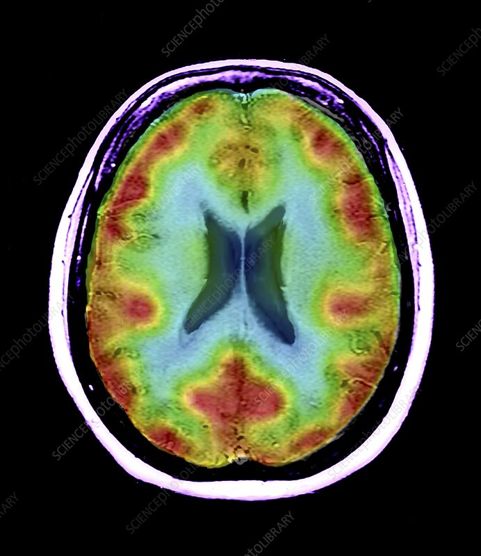 Normal brain blood flow. Composite coloured magnetic resonance imaging (MRI) and single-photon emission computed tomography (SPECT) scan of an axial section through the brain of healthy 54-year-old, showing normal blood supply (orange-red) to the supratentorial region.