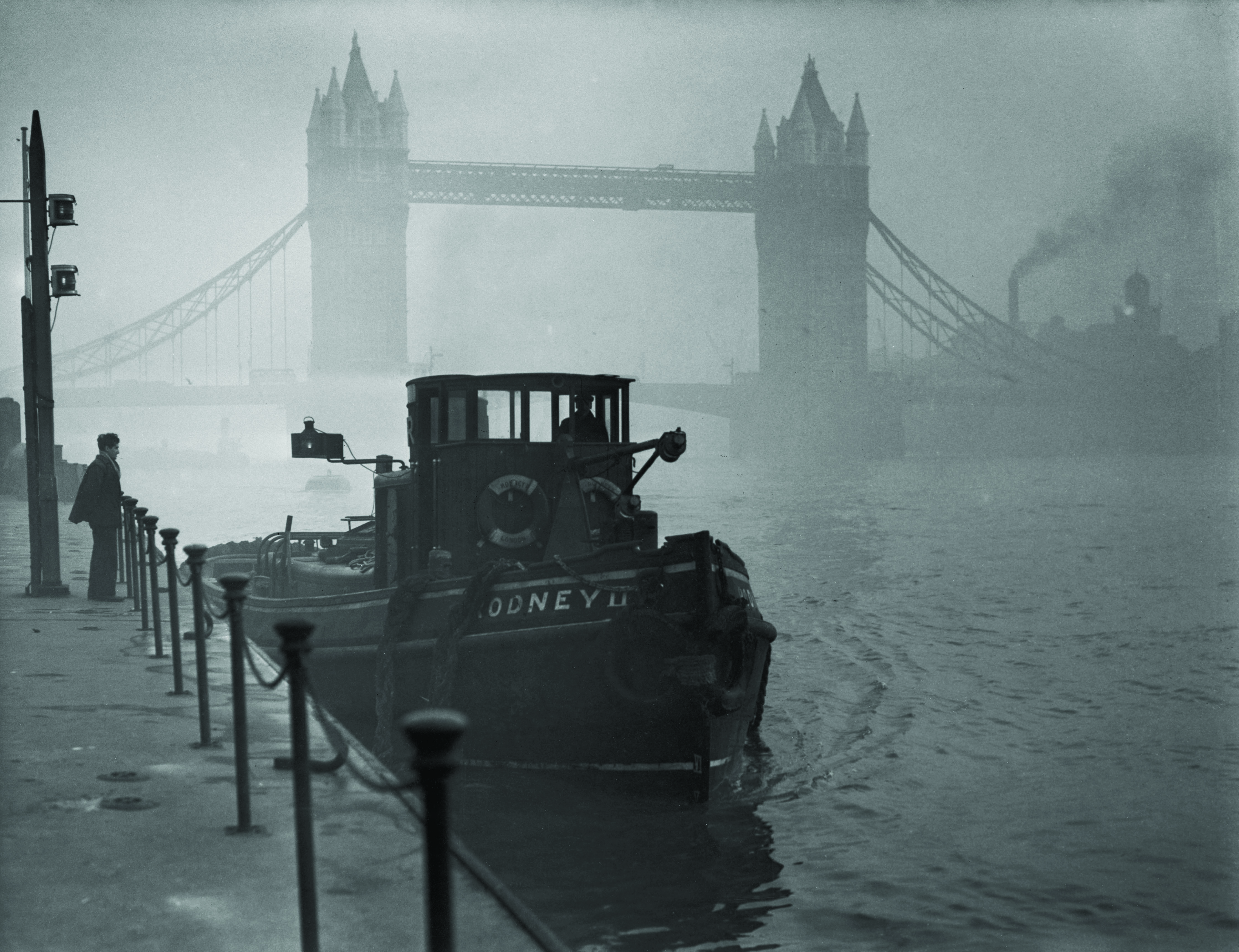 A tugboat on the Thames near Tower Bridge in heavy smog, 1952.